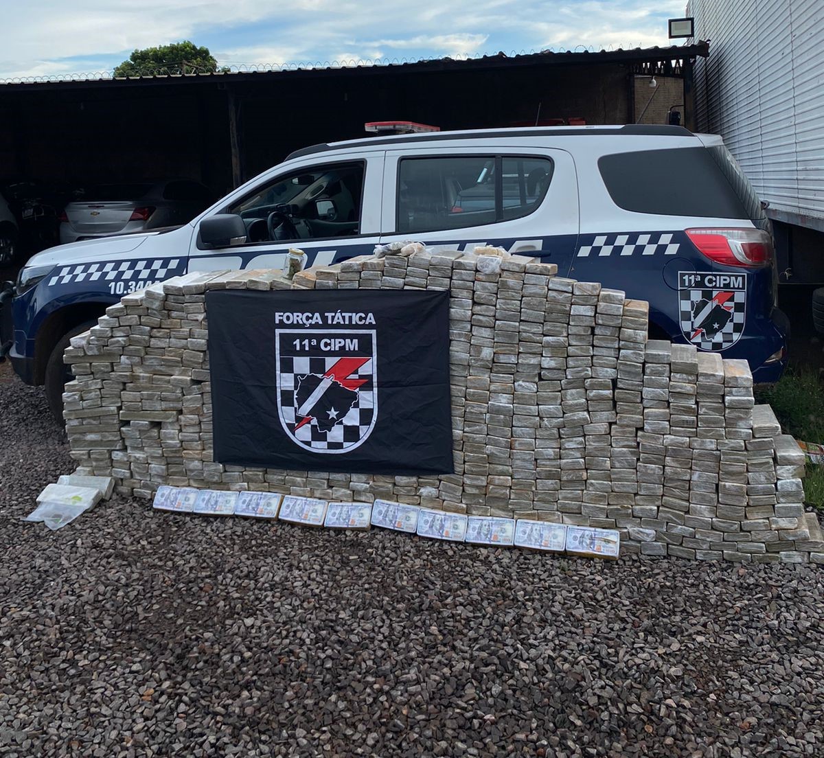 Durante o desdobramento da abordagem, os indivíduos informaram a existência de mais entorpecentes em uma residência próxima. Seguindo as informações fornecidas, os policiais se dirigiram ao local indicado e se depararam com uma grande quantidade de drogas. No total, foram apreendidos 722 Kg de maconha e 9,4 Kg de pasta base de cocaína, além de diversos materiais relacionados ao tráfico, como rolos de plástico filme, embalagens plásticas e balanças de precisão.