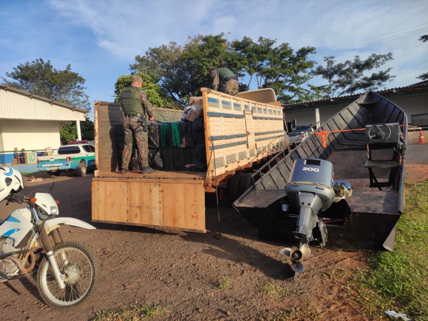 No decorrer de uma vistoria em área de Reserva Legal no município de Japorã – MS, uma das equipes se deparou com indivíduos, às margens do rio, descarregando uma carga de um caminhão para uma lancha de grande porte, que se encontrava em um porto da região conhecido como ‘Big Brother’. Ao avistarem a viatura policial, os indivíduos empreenderam fuga em embarcações que estavam no rio. Após diligências, a guarnição constatou que o caminhão estava carregado com diversas caixas de cigarro de marca paraguaia (8.900 maços) e que o veículo estava com restrição de furto. Diante das circunstâncias, a lancha, o caminhão e a carga de cigarros foram apreendidos.
