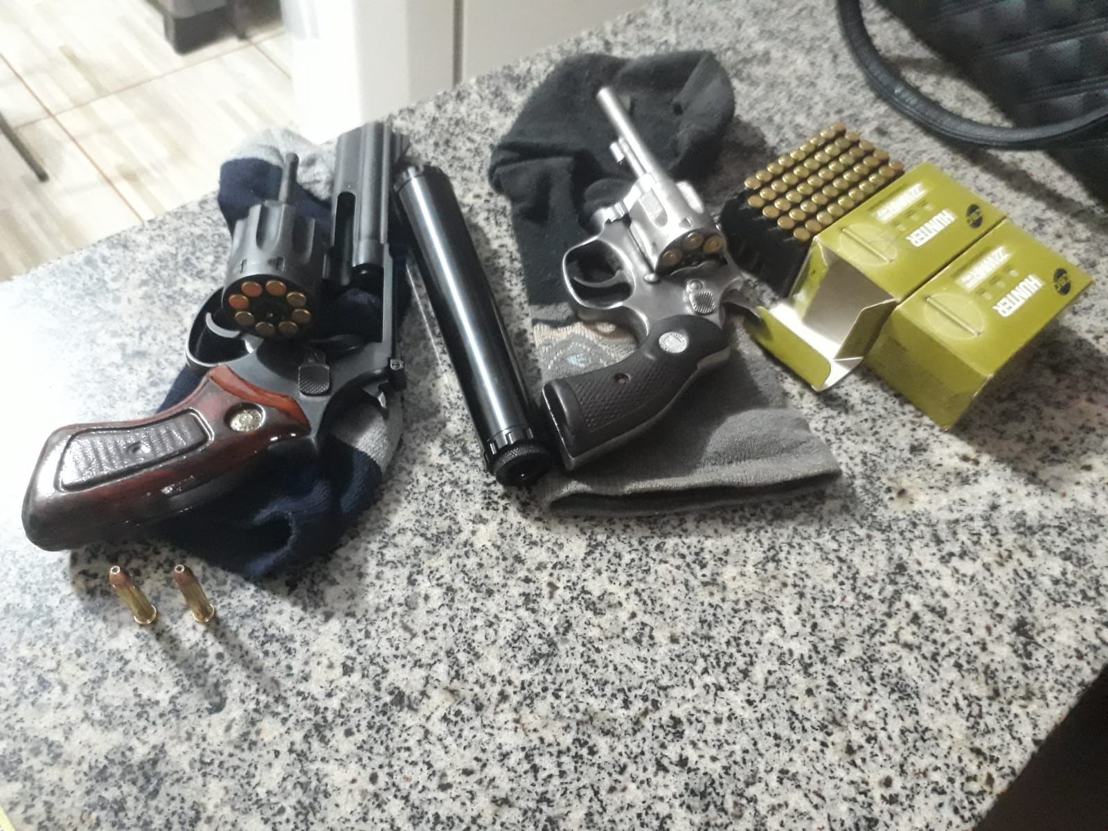 Em uma das residências foram localizadas duas armas de fogo municiadas, além de diversas munições escondidas. Ao checar as informações, constatou-se que tais armas eram produto de furto, motivo pelo qual o indivíduo foi preso em flagrante por posse de arma de fogo e receptação qualificada.