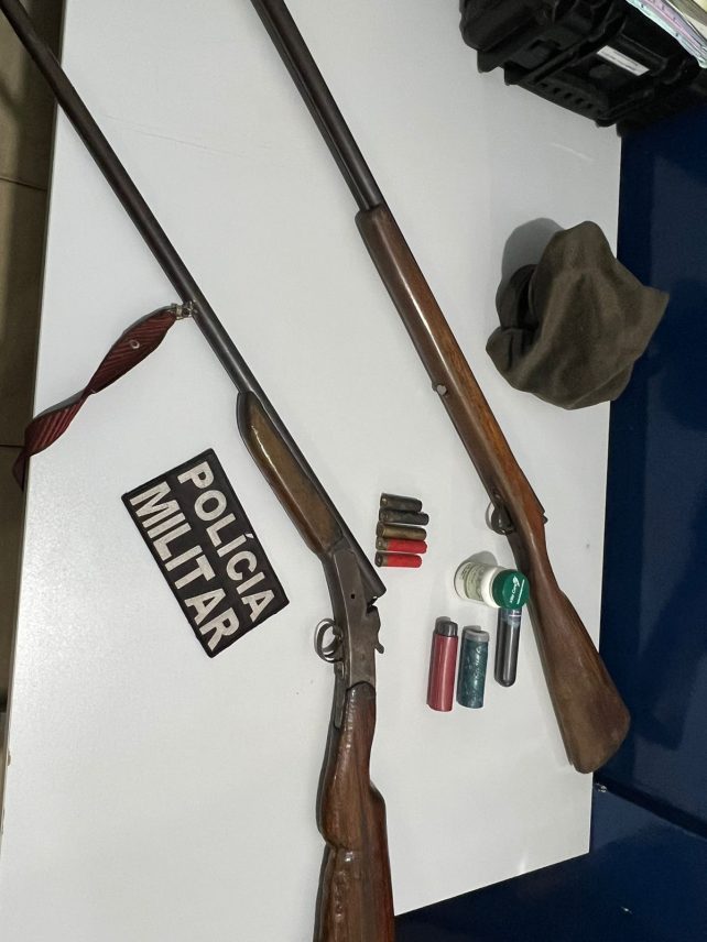 Diante do estado de flagrância foi realizado busca no imóvel que culminou na apreensão de duas armas de fogo, e alguns apetrechos de preparo (chumbo; pólvora e espoletas) sendo então realizado a condução do detido e apresentação na Delegacia de Polícia.