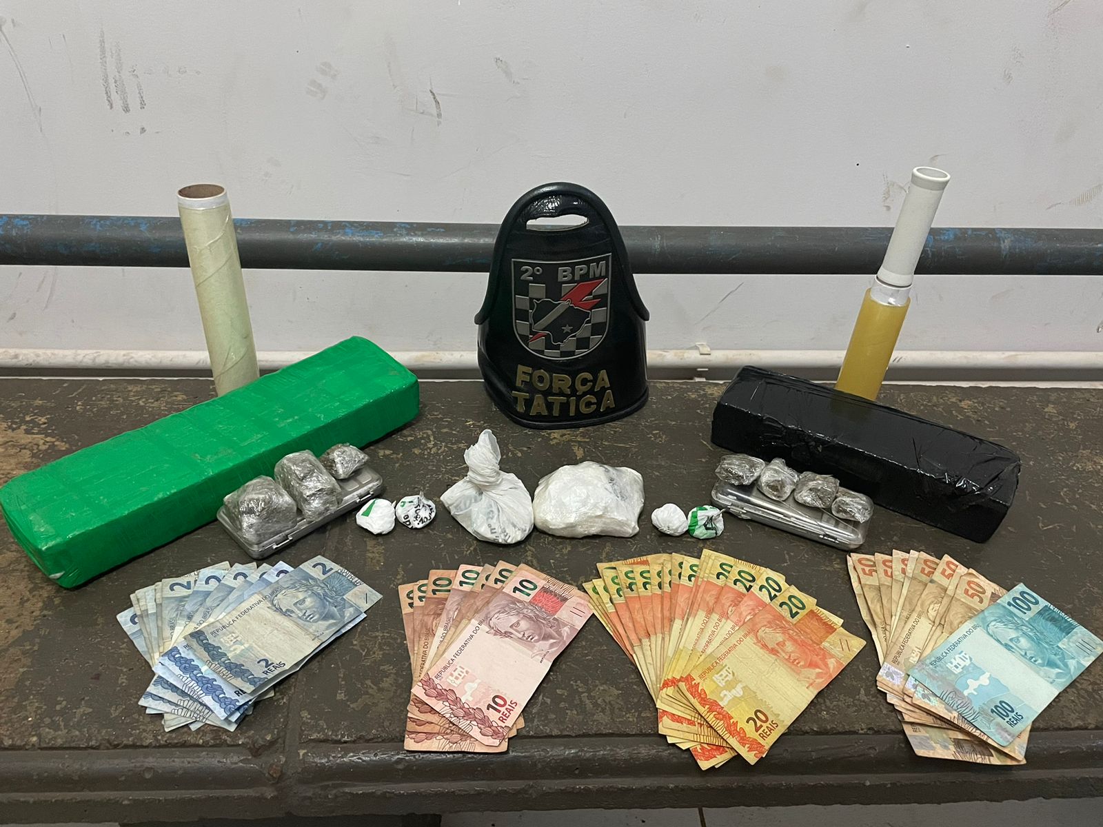 Diante a informação foi realizada a abordagem policial de um indivíduo de 61 anos que era morador do local e se encontrava na frente da residência apontada nas denúncias, com o qual foi localizado a quantia de R$1.234,00, não sabendo explicar a origem do dinheiro tampouco informar o valor que portava. Durante busca na residência a guarnição da Força Tática veio a localizar um estojo escolar com 6 porções de maconha prontas para venda (pesando 70 gramas), sendo localizado ainda no estojo um molho de chaves que abria um quarto em que os policiais localizaram embaixo de uma pia duas sacolas plásticas contendo: 2 tabletes de maconha (pesando 1.700 gramas), 6 porções de substância análoga a cocaína (pesando 178 gramas), 2 balanças de precisão e petrechos utilizados no embalo da droga.