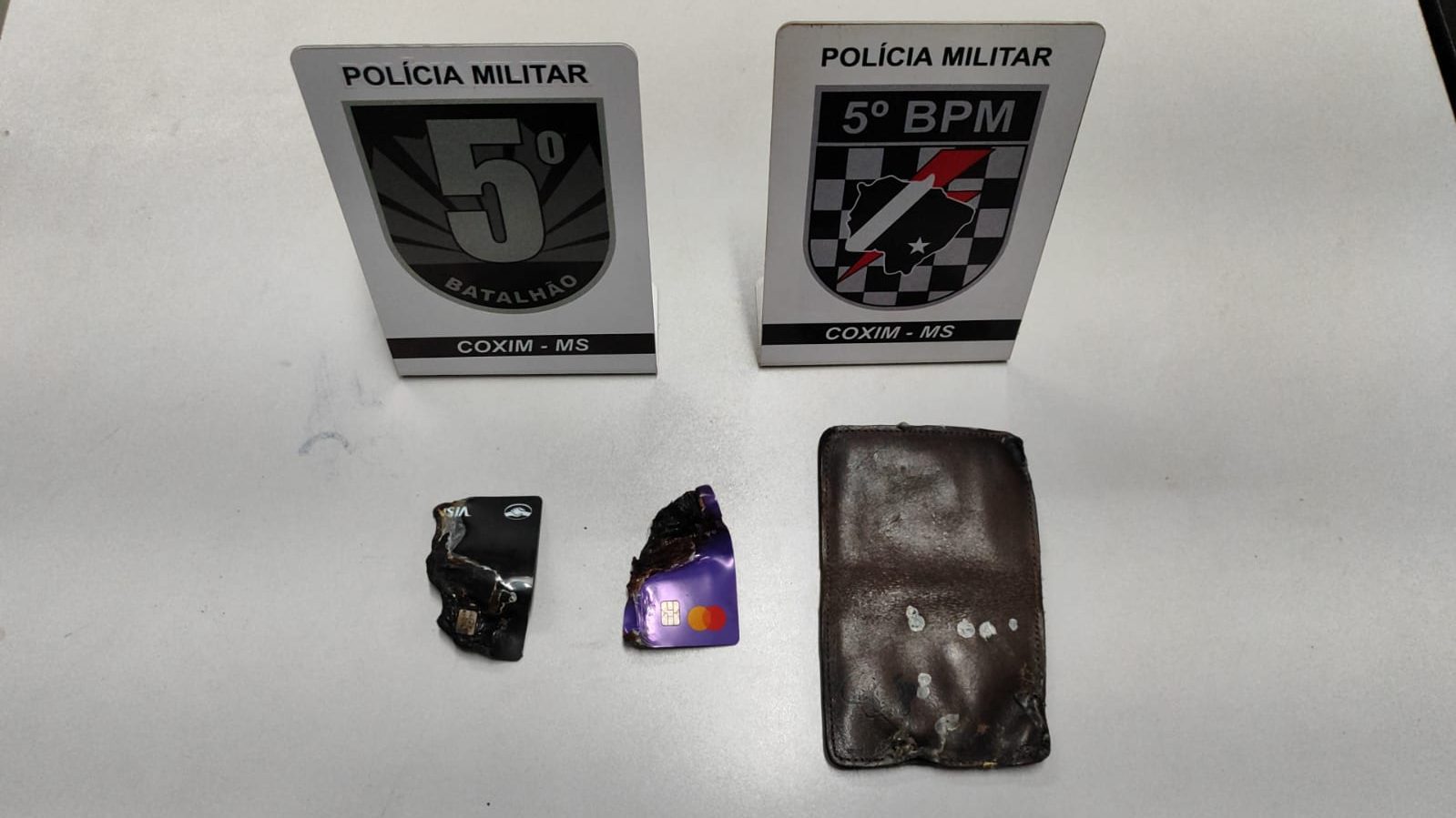 Durante a abordagem, ele confessou ser o autor do furto, admitindo ter levado carne, ferramentas, um cartão de crédito e outros produtos do estabelecimento. Na revista pessoal, os policiais encontraram um cartão de crédito e uma carteira pertencentes à vítima, que estavam parcialmente queimados. Os militares realizaram checagem através do Sistema Integrado de Gestão Operacional e constataram um mandado de prisão em aberto.