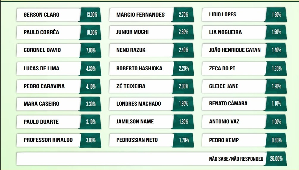 O presidente da Assembleia Legislativa de Mato Grosso do Sul teve avaliação de melhor atuação entre 3 mil entrevistados, alcançando 13% dos votos. Paulo Corrêa (PSDB) foi o segundo melhor avaliado com 10%. No entanto, a maior porcentagem foi para 25% de pessoas que não souberam avaliar a atuação parlamentar.